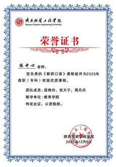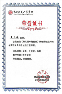 近日,陕西服装工程学院 2025年高职(专科)校级优质课程评选结果正式公布,教育学院选送的《教师口语》与《幼儿园环境创设》两门课程凭借扎实的建设成效、鲜明的教学特色及突出的育人价值,成功入选优质课程名单。12月9日,学校举行2025年高职(专科)优质课程颁奖典礼,为获奖课程团队颁发荣誉证书,教育学院获奖教师代表受邀参会,接过这份沉甸甸的荣誉。